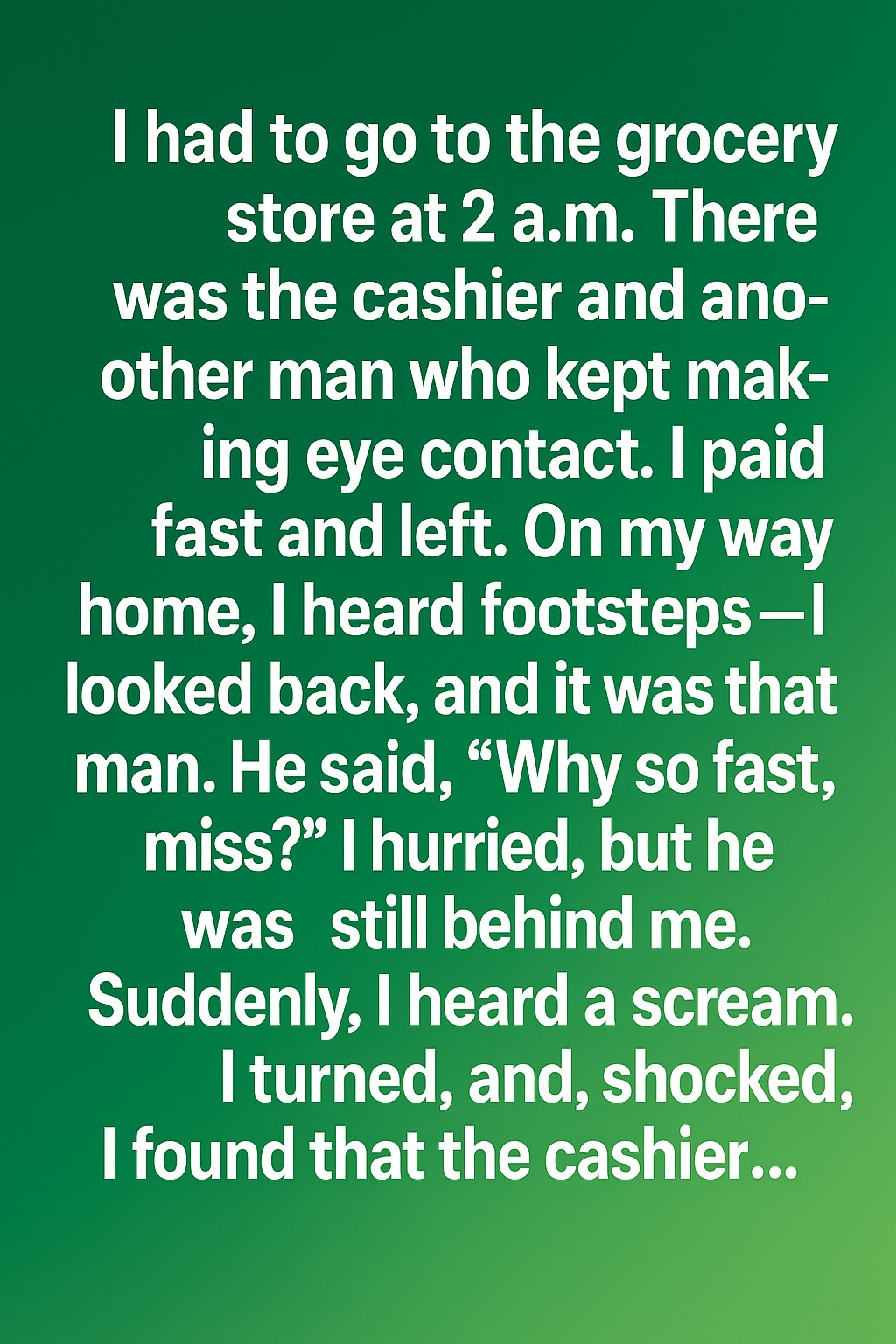 I had to go to the grocery store at 2 a.m. There was the cashier and another man who kept making eye contact. I paid fast and left. On my way home, I heard footsteps—I looked back, and it was that man. He said, “Why so fast, miss?” I hurried, but he was still behind me. Suddenly, I heard a scream. I turned, and, shocked, I found that the cashier……was running toward us, waving his arms and shouting. For a split second, I thought the situation had gone from uncomfortable to dangerous. My heart pounded as the cashier reached us, out of breath and pale. “Miss, wait!” he called out. “You left your wallet at the counter.” For a moment, everything froze—the streetlights humming above us, the cold air burning in my lungs, and the man beside me staring in confusion. Then the cashier looked at him and frowned. “Sir, I told you not to leave the store. Police are on their way. Please stay where you are.” My fear turned into bewilderment as the man raised his hands defensively, mumbling something about misunderstanding.