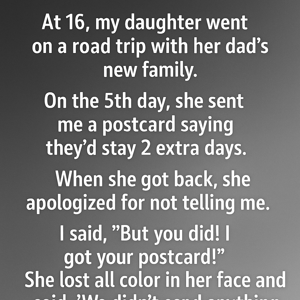 At 16, my daughter went on a road trip with her dad’s new family. On the 5th day, she sent me a postcard saying they’d stay 2 extra days. When she got back, she apologized for not telling me. I said, “But you did! I got your postcard!” She lost all color in her face and said, “We didn’t send anything.” For a moment, we both just stared at each other, caught between confusion and unease. I remembered the postcard clearly—the handwriting looked like hers, the message was warm, and the photo on the front showed a scenic overlook she had mentioned wanting to visit. Still, something about that moment tugged at me. I brought the postcard from the drawer where I kept it and handed it to her. She studied it closely, her fingers trembling slightly. “Mom… this isn’t my handwriting,” she whispered. The realization made my stomach twist. We sat together at the kitchen table as she explained that during those two extra days, they’d been in areas with no cell reception and absolutely no access to mailing services. She insisted she hadn’t sent anything, and no one in her dad’s family had, either. Continue reading…
