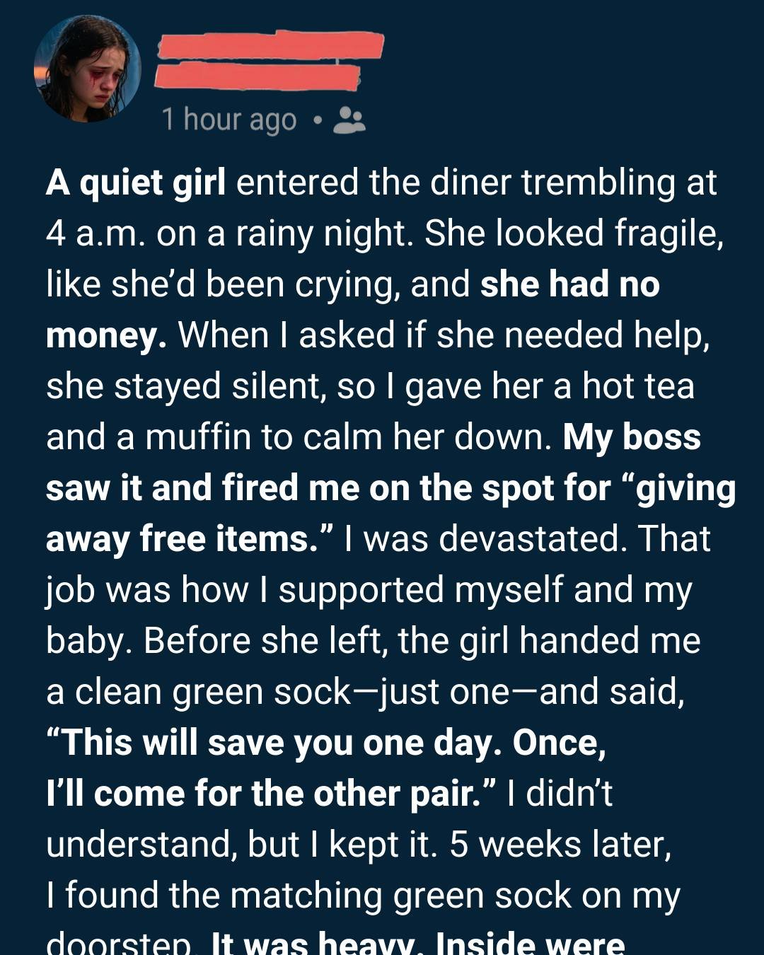 I tried to explain, but he wouldn’t hear a word. I stood there shaking, humiliated, while the quiet girl watched with wide, guilty eyes. When she finally stood to leave, she pressed something into my hand — a single clean green sock.