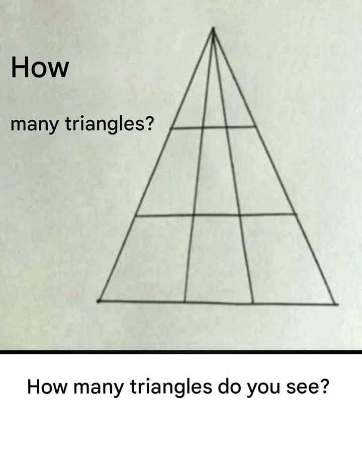 Our brain loves to identify the most obvious small triangles and… forget the larger ones, formed by combining multiple areas. The result: we underestimate. In the classic configuration (4 rows formed by 3 lines parallel to the base), the correct answer is 27. If