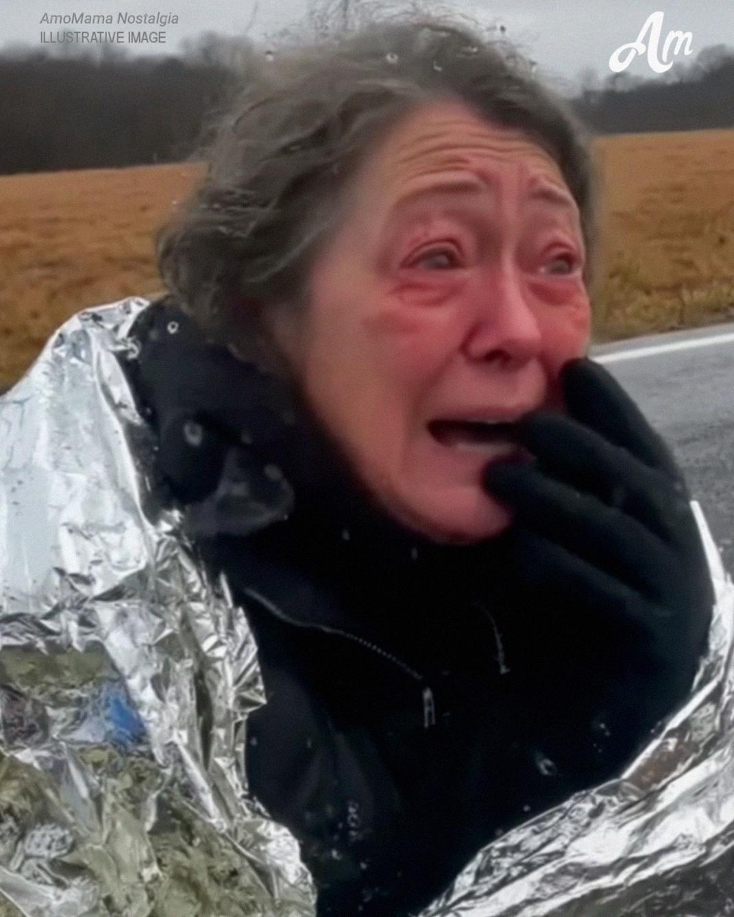 Her gray hair hung in damp strands around her face. Both hands shook uncontrollably in her lap. She wasn’t crying or calling for help… just staring at the destroyed car with blank, terrified eyes.