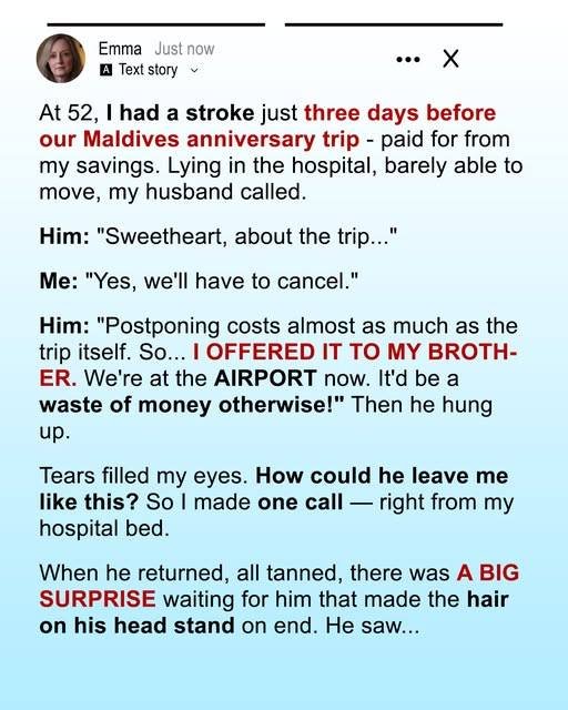 Three days before our dream anniversary trip to the Maldives, my world suddenly flipped upside down—I had a stroke. I was at home, chopping bell peppers for dinner, when everything changed in a heartbeat. One moment, the knife was in my hand; the next, it fell to the floor with a loud clatter as I collapsed, unable to move.