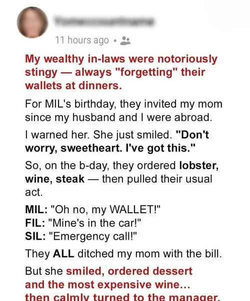 My husband’s parents were the kind of people who loved fine dining and luxury, but when the check arrived, they somehow never seemed to have their wallets. Maybe it was a purse left in the car, or a sudden phone call that whisked them away before the bill appeared.
