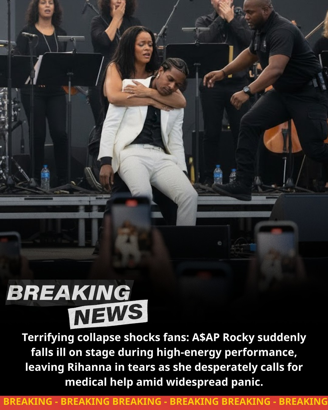 In a night that was supposed to be filled with high-energy beats, flashing lights, and unstoppable vibes, a sold-out concert in Los Angeles turned into sheer chaos when rap icon A$AP Rocky suddenly collapsed on stage. Eyewitnesses describe the moment as “pure horror,” with superstar Rihanna, his longtime partner and mother of their three children, rushing from the wings to his side in a desperate bid to save him. The entire venue erupted in panic as RiRi, tears streaming down her face, frantically called for an ambulance while holding the “rap king” in her arms.