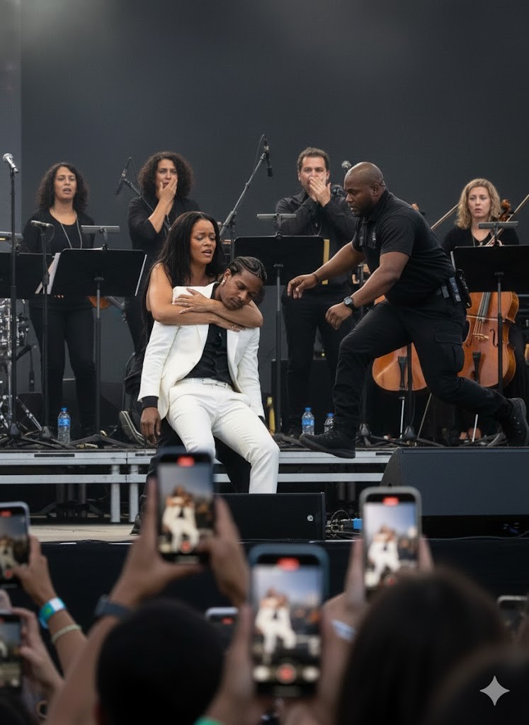 Rihanna, elegant in a glamorous black outfit with her signature long hair flowing, leaped over barriers and knelt beside him. Witnesses say she checked his pulse, cradled his head, and immediately dialed 911 on her phone, all while sobbing and pleading for help. Security and medical staff rushed the stage as the crowd’s phone lights turned into a sea of frantic flashes, many fans openly weeping and praying.