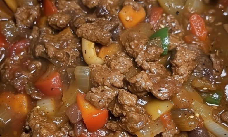 Tender strips of sirloin steak, onions, and bell peppers are slow-cooked in a savory sauce for a classic, flavorful one-pot meal.