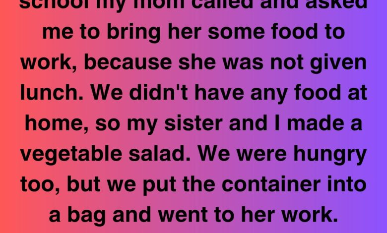 When we got there, we found her in the breakroom with her coworker, a kind woman named Mrs. Danika. Mrs. Danika was in her mid-50s and had a quiet voice. She was rubbing her head, looking tired. My mom’s face lit up when she saw us, but her eyes quickly looked at the salad container.