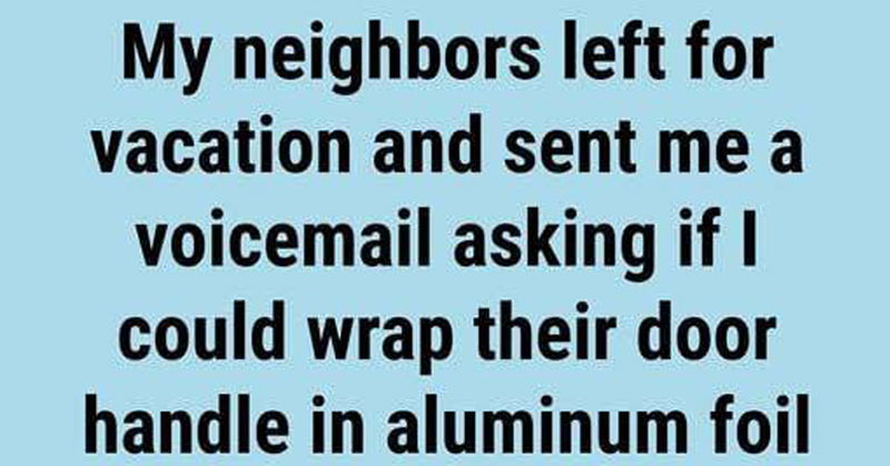 When my neighbors went on vacation, they left me a voicemail asking if I could cover their door handle with aluminum foil.
