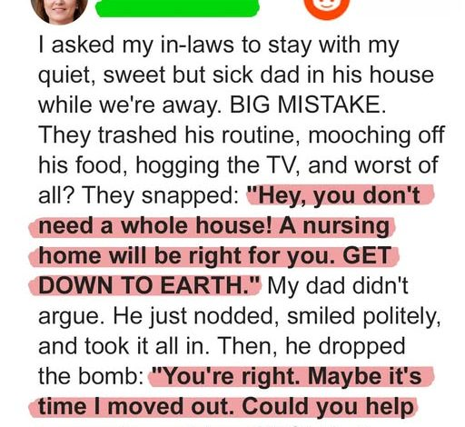 When we planned a short getaway, I asked my in-laws to stay with my father—a gentle, soft-spoken man who didn’t need medical care, just some company and someone nearby in case he needed help. I imagined a quiet week: shared meals, a few TV shows, maybe some light conversation. What I didn’t anticipate was how quickly his peaceful home would be disrupted.