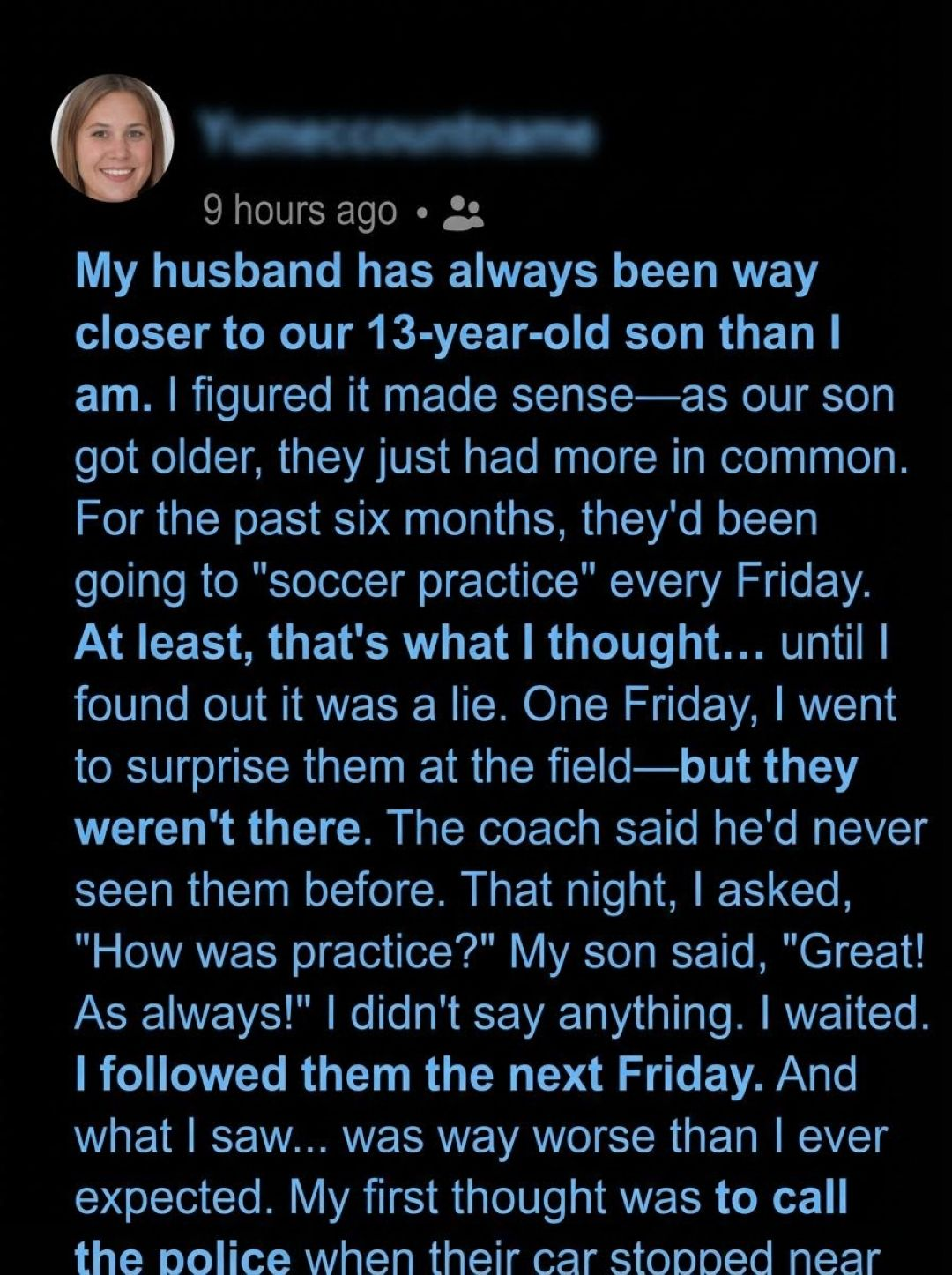 For years, I had quietly accepted the shape of our family as it was. My husband and our son shared a closeness that felt natural, almost inevitable, and I told myself that love didn’t need to be evenly measured to be real. When they began leaving together every Friday for what I believed was soccer practice, I felt a small, private relief. It gave them time, and it gave me space. Still, a faint unease crept in when their routine became untouchable—no schedule changes, no casual stories, just the same answers, rehearsed and neat. I ignored that feeling until the Friday I stood on the empty field, listening to a confused coach tell me he’d never seen either of them before.