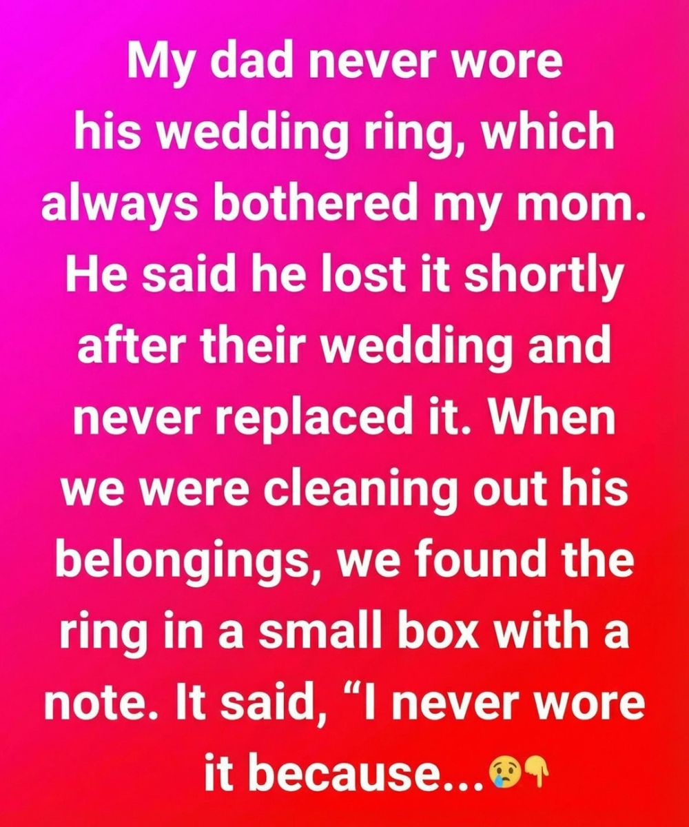 When we began sorting through my dad’s things after he passed, we expected nothing more than the usual odds and ends—old jackets, worn tools, faded receipts. Instead, we uncovered a small box that completely reshaped what we thought we knew about him. Inside lay his wedding ring, carefully wrapped in a soft cloth, along with a handwritten note that began, “I didn’t wear it because…”