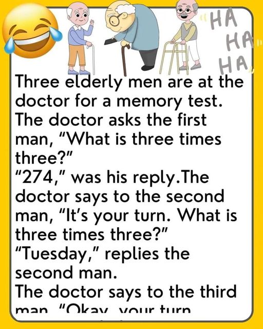 The doctor asks the first man, “What is three times three?”