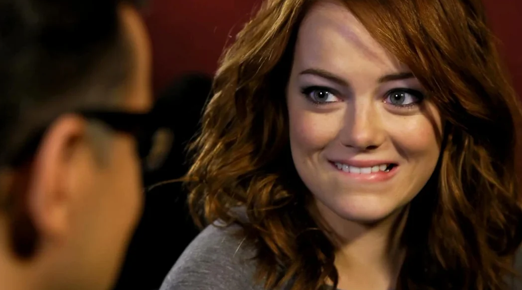 Clue: She looks down, turns slightly away, or lifts her shoulders gently.