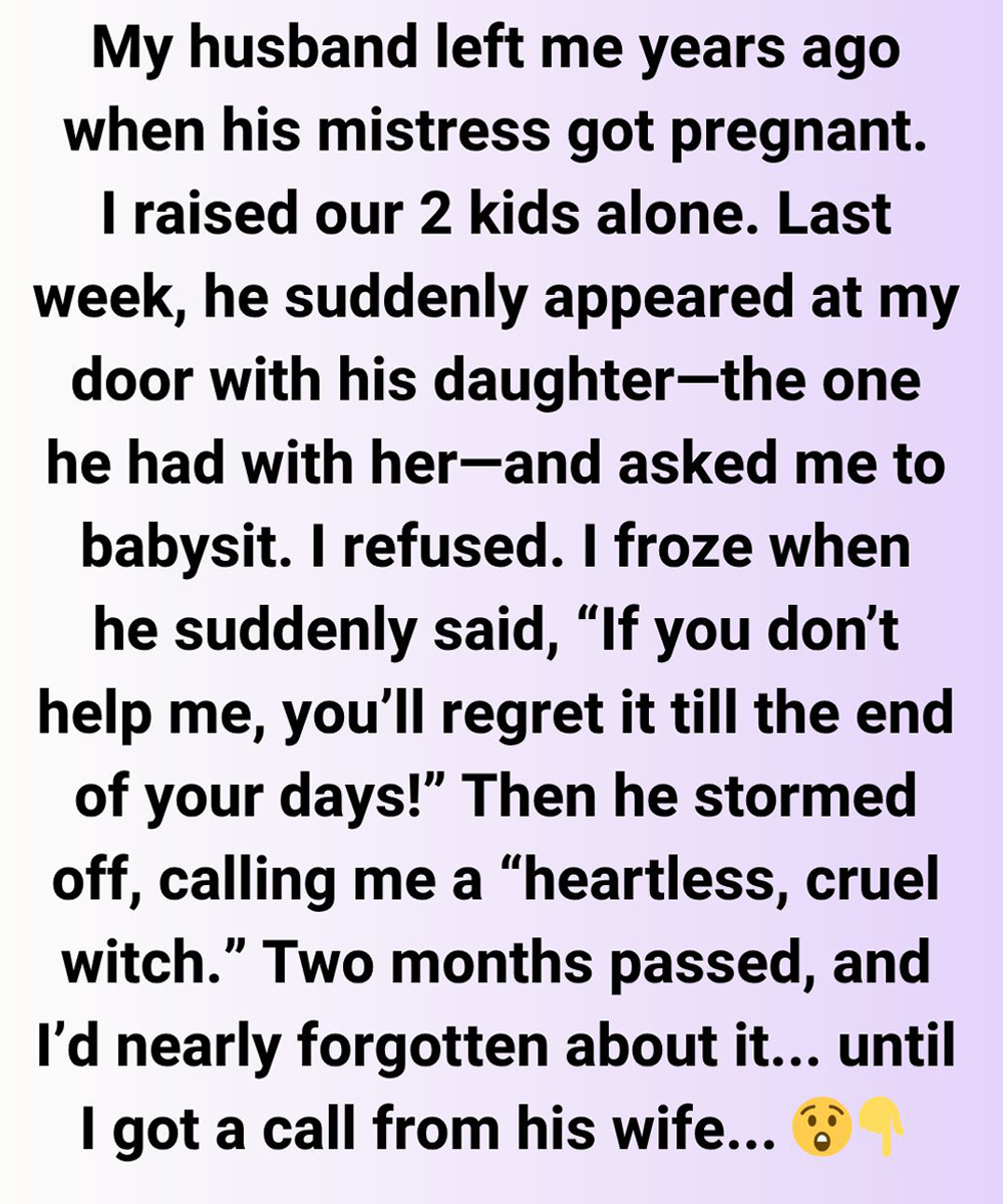 Years ago, my husband left me when his mistress became pregnant. I raised our two children on my own. Then, last week, he unexpectedly showed up at my door with his daughter—the one he had with her—and asked me to babysit.